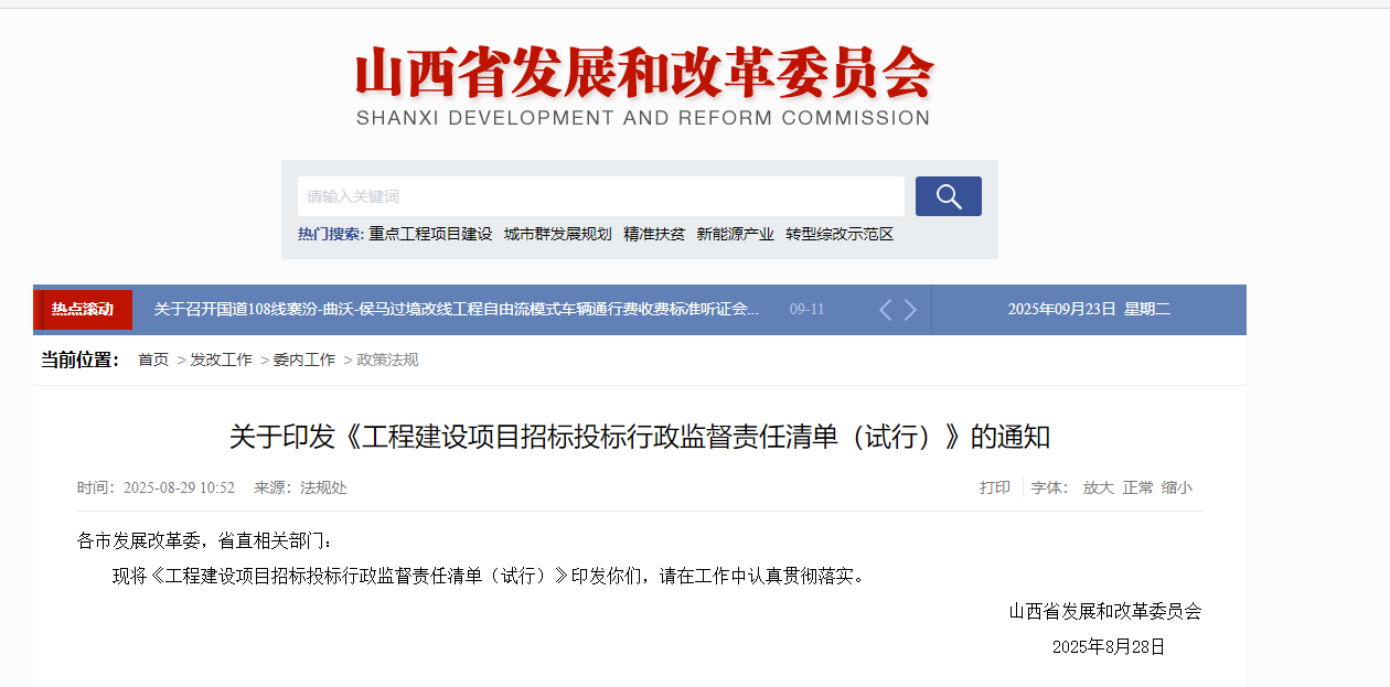 近日,山西省发展改革委制定全省《工程建设项目招标投标行政监督责任清单(试行)》,旨在完善促进招标投标市场规范健康发展的长效机制,严肃整治招标投标领域不作为乱作为问题。